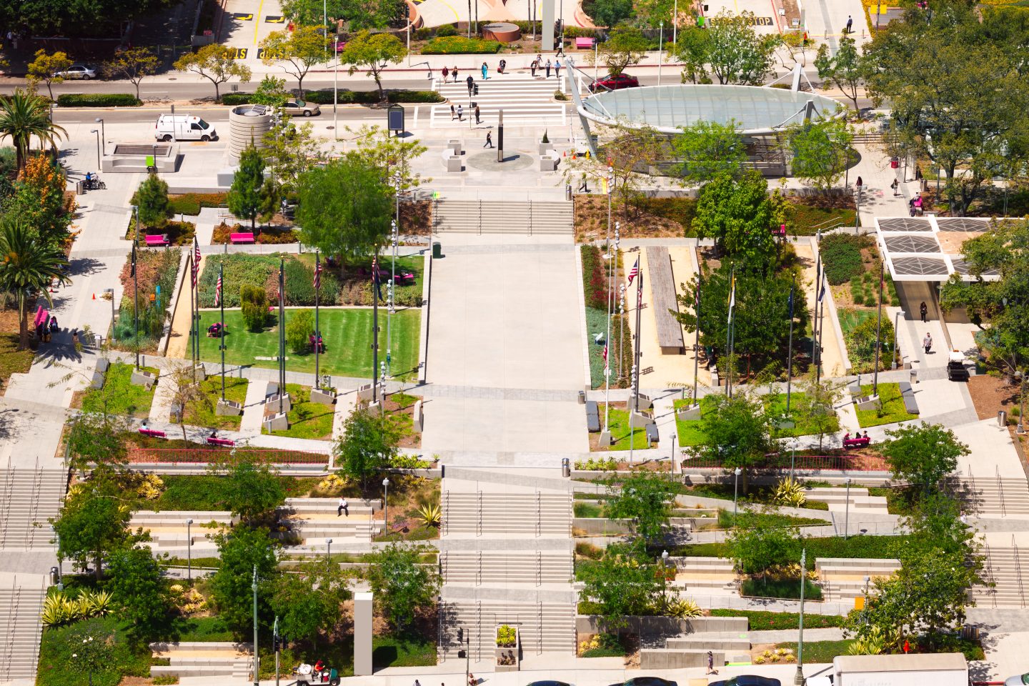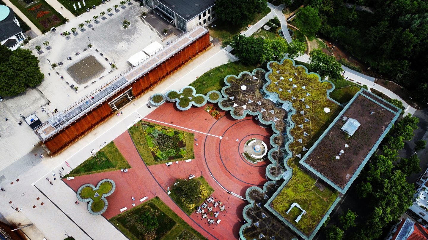 Geometría marcada, cubiertas verdes y zonas estanciales vinculadas a equipamientos urbanos.